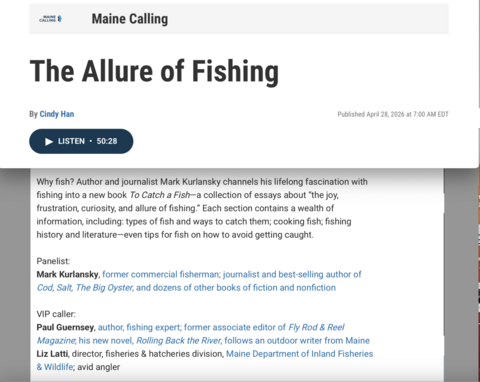 Today, April 28th, along with fellow author Mark Kurkansky I participated in a Maine Public Radio ("Maine Calling") discussion about fly-fishing—and about Rolling Back the River. The host was Cindy Han. The show begins with Kurlansky, and I begin talking about 10 minutes in, after the break. You can listen to the full podcast episode here